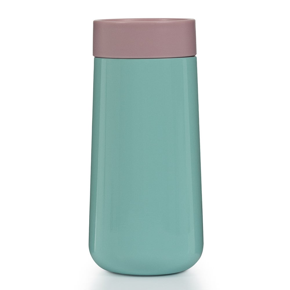 再利用可能なトラベルマグです。断熱構造で飲み物を温かく保ち、プッシュボタンで簡単に開くことができ、360°どこからでも飲むことが可能です。デザインは、スリムでシルエット。持ち運びも便利なので、外出先でも簡単に使用できます。