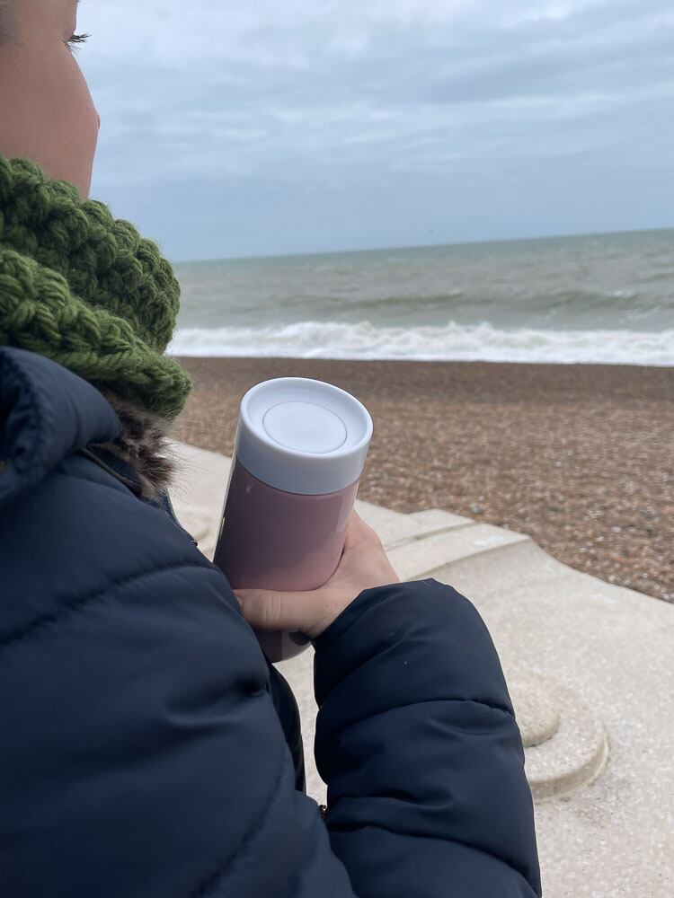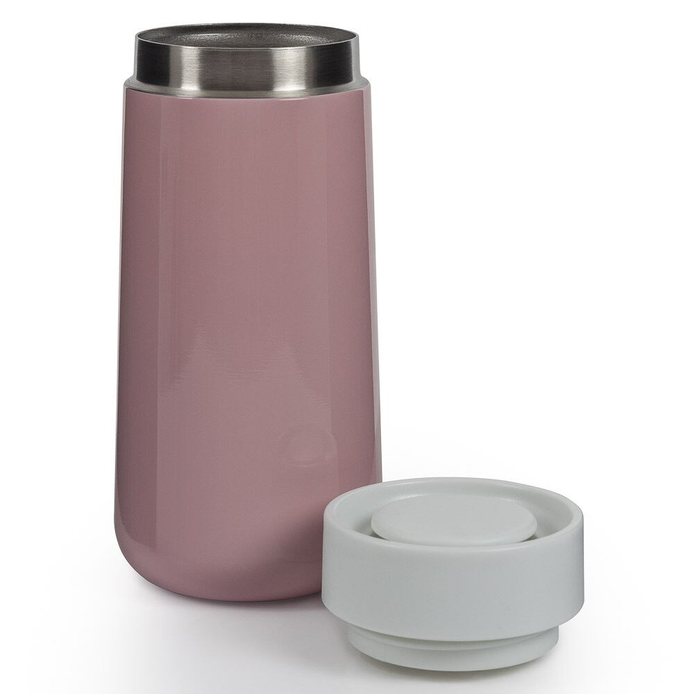 再利用可能なトラベルマグです。断熱構造で飲み物を温かく保ち、プッシュボタンで簡単に開くことができ、360°どこからでも飲むことが可能です。デザインは、スリムでシルエット。持ち運びも便利なので、外出先でも簡単に使用できます。