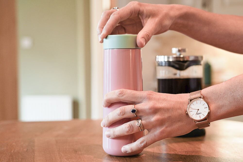 再利用可能なトラベルマグです。断熱構造で飲み物を温かく保ち、プッシュボタンで簡単に開くことができ、360°どこからでも飲むことが可能です。デザインは、スリムでシルエット。持ち運びも便利なので、外出先でも簡単に使用できます。